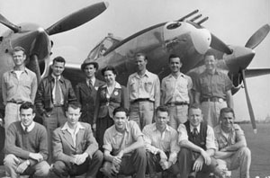 Shot of group at Lockheed Aircraft in 1945. Esther Hennings worked as a Technical Statistician, and their group developed designs for airplanes. |